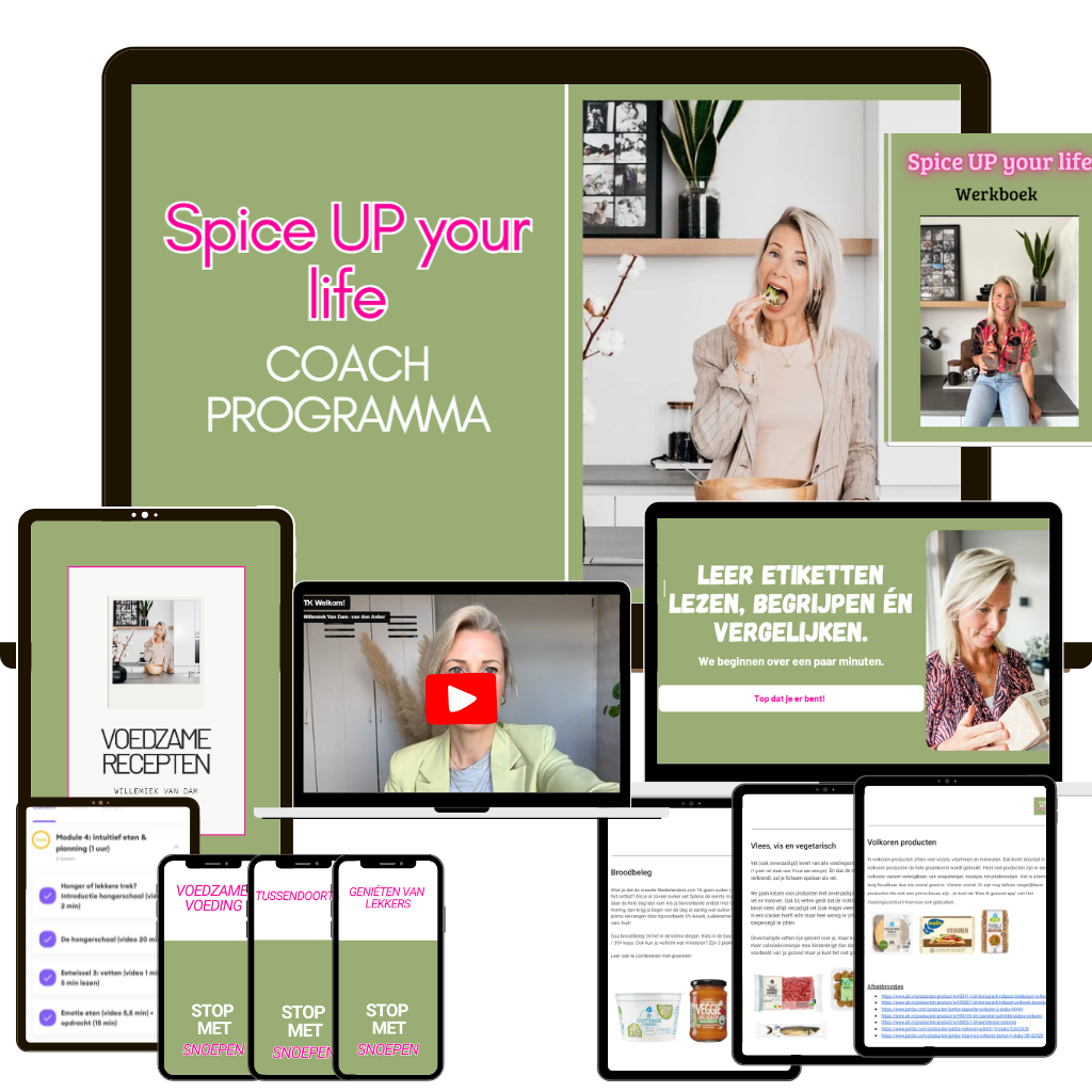 Het Spice UP your life coach-programma is een online programma gecombineerd met persoonlijke coaching. Het online programma zit boordevol video’s en opdrachten welke jij in eigen tempo kan volgen. De coaching-sessies zijn 1-op-1 want iedereen is uniek en heeft eigen persoonlijke uitdagingen.
